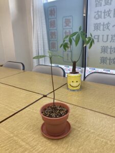教室内に緑を増やしたくて、アボカドの種を水につけておきました。